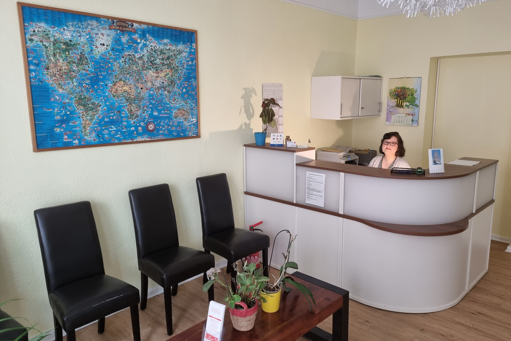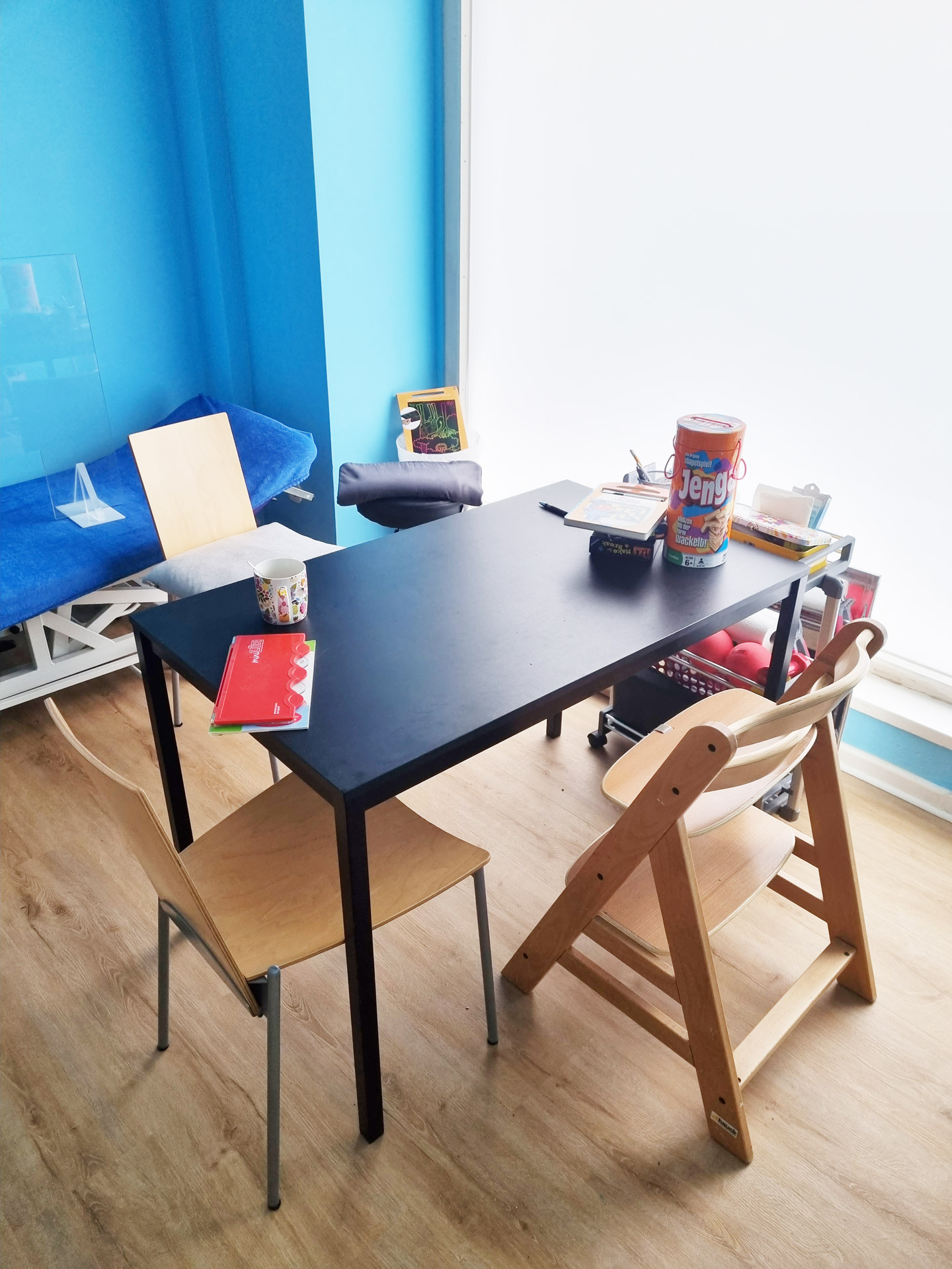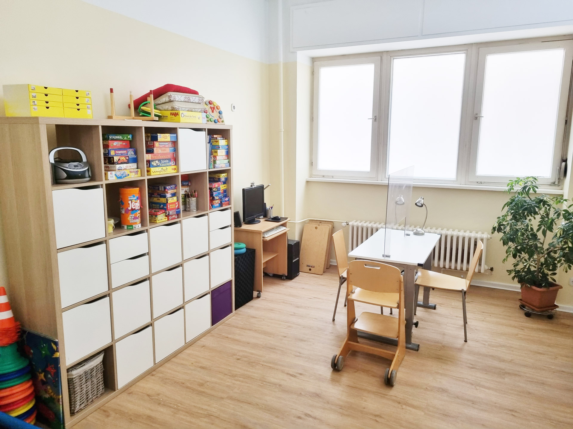 Sie erwartet Eingang mit Tresen und Wartebereich, ein Raum für Anamnese, Gespräche, kognitive Spiele und kreative Gestaltung. Weitere Räume erlauben Motorikschulung, Verbesserung der Körperwahrnehmung, Koordination und Handlungsplanung.